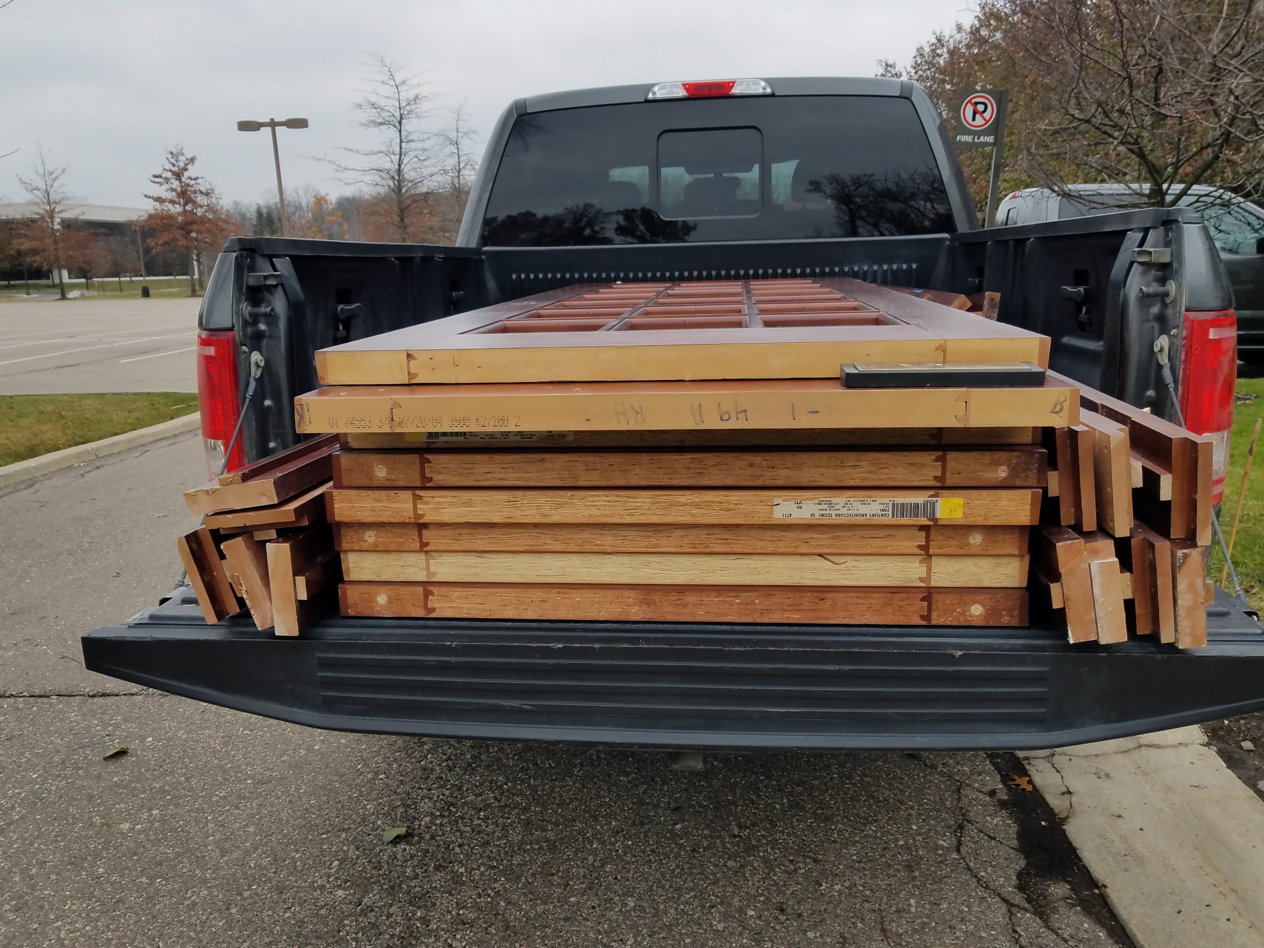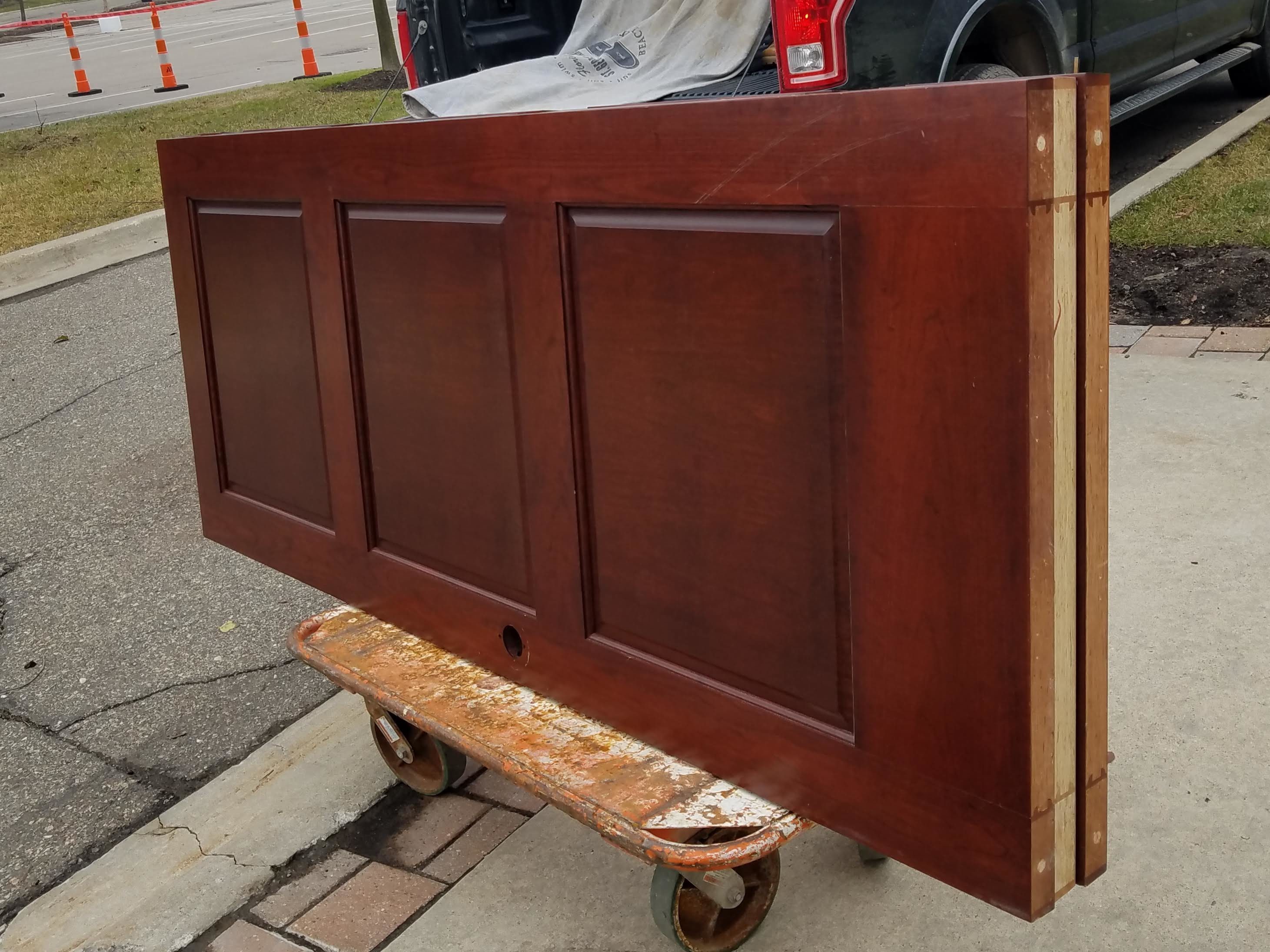 The doors come from an insurance office in Farmington that is being remodeled. The doors are commercial quality, 7.5 ft tall, very heavy with a cherry finish. All of the hardware and the frames for all but the double doors were also donated. The frames are solid cherry. It’s envisioned that the double doors will open to our multi-purpose room. Each door and it’s associated hardware and frame(s) were numbered and cataloged for the future.